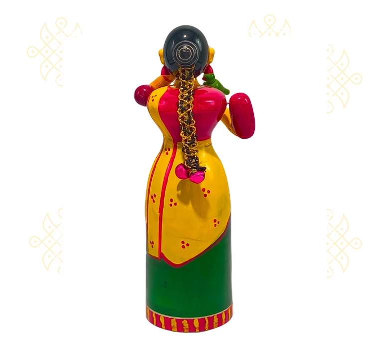 The Etikoppaka Parrot Lady Showpiece is a beautifully handcrafted wooden figurine, representing the rich toy-making tradition of Etikoppaka, Andhra Pradesh. Made from soft Ankudu wood and painted with natural dyes, this eco-friendly showpiece showcases the elegance of traditional Indian craftsmanship.