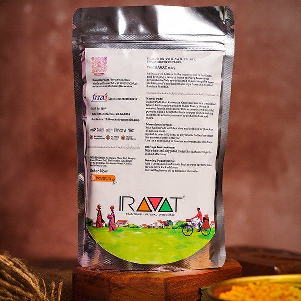 Red Gram (Toor Dal), Bengal Gram (Chana Dal), Black Gram (Urad Dal) Dry Red Chillies, Coriander Seeds, Cumin Seeds, Garlic, Salt.
